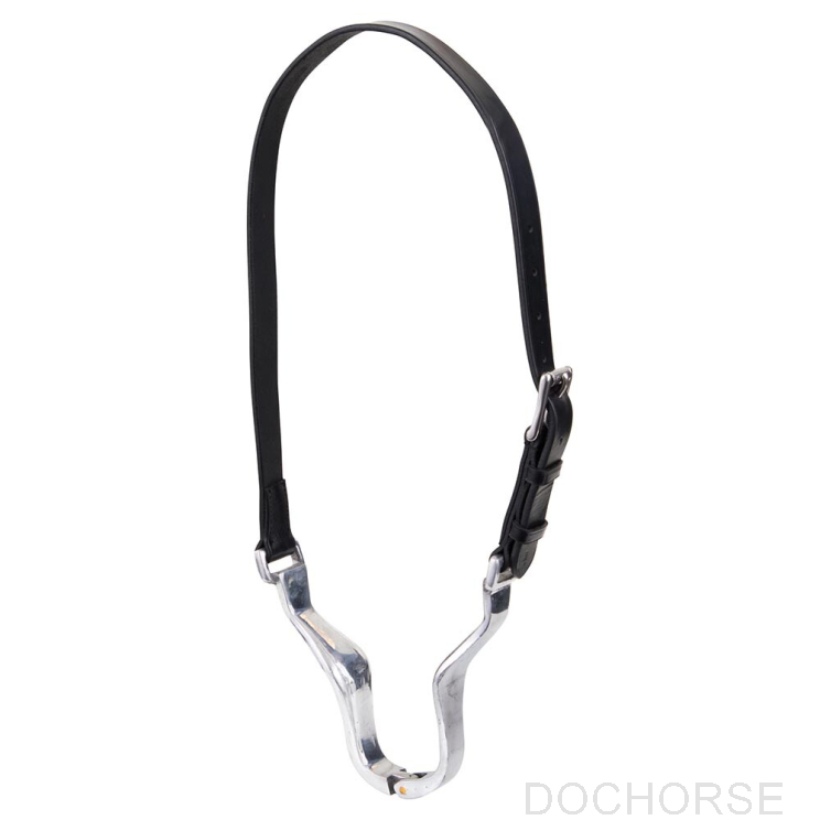 Leather strap with an aluminium centre which is attached just behind the horse's head with a roller buckle.